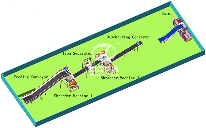 Combustible Waste Shredding production line designed by Guoxin machinery goes through the shredding + iron separator+baling (or RDF Briquette Machine), the material is sent to the combustible Waste shredder through the chain plate conveyor for shredding, the material after shredding is sorted by the iron separator (select iron products). The shredded materials are transported by the discharge conveyor to the RDF forming machine to make fuel rods directly sold to the thermal power plant as fuel, or directly transported to the hydraulic baler to compress and pack, and then sold abroad, which not only disposed of garbage, but also earned profits.