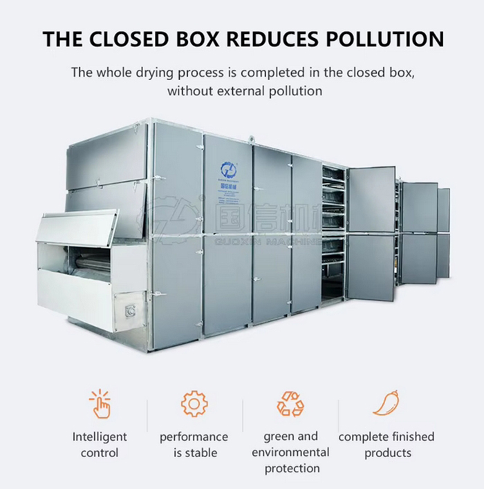 The hot air volume, mesh belt running speed, temperature and humidity can be adjusted by the electric control system.