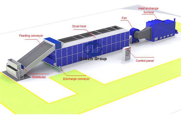 The continuous belt dryer machine utilize the hot air produced by the heat furnace as the drying medium.